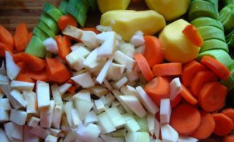 • Морковь, картофель и лук нарезать мелкими кубиками