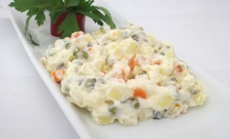 • Добавить мелко нарезанные маслины, зелень и залить все майонезом