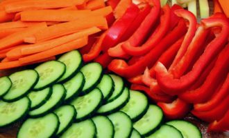Нарезать кубиками морковь и перец